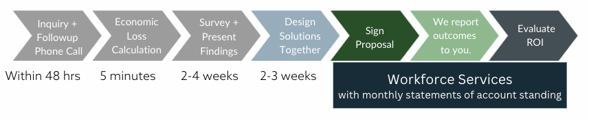 Through a no-pressure process, we provide partnership starting with your inquiry, helping you to determine if now is the right time to invest in workforce solutions, get the right people on board, and create a service implementation plan that will best address the pain points you and your workforce are currently experiencing. We directly provide these services, reducing the number of entities involved in helping you retain the investment you've made in your staff.